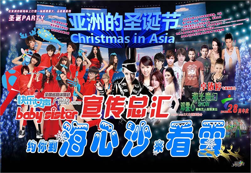 海心沙亞洲圣誕節連續三晚在中心舞臺獻上不同主題演唱會:2011快樂女聲、知名歌手容祖兒、古巨基、張敬軒、洪卓立、卓依婷、央視春晚激光舞藝人鄧雯心、“廣州林志玲”劉亭婷、廣州金牌情景短劇《外來媳婦本地郎》主要演員及廣東著名主持人等,均悉數登臺。