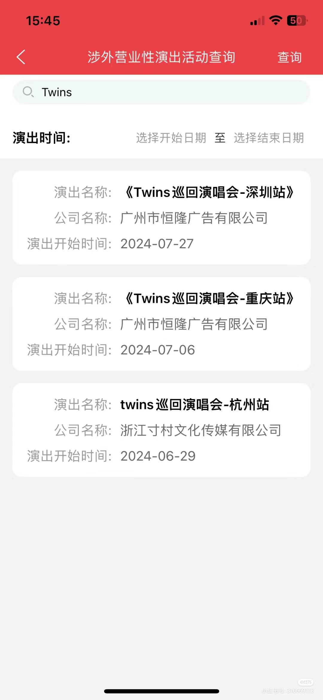 目前Twins 巡回演唱會深圳站、重慶站、杭州站均審批通過